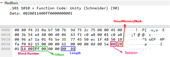 After establishing a TCP session, the EcoStruxure™ Control Expert software sends a request to the PLC (port 502/TCP) to read a memory block using UMAS function 0x20, which does not require authentication.