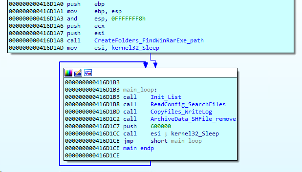 Once an archive is created, the implant uses SHFileOperationW to remove files located in “C:\ProgramData\NetWorks\fl”. In the last step of the loop, the implant goes to sleep for 10 minutes.