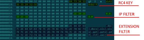 The config is encrypted with RC4 with the key “bGkds&sy6$^3gsa” and is used to store another RC4 key, an IP filter, and a list of file extensions by which files to be copied to “C:\ProgramData\NetWorks\fl” should be filtered. The implant also writes all paths to the file “1.log”. Right after reading the config, the implant starts searching for files on all drives connected to the infected machine.