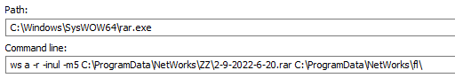 All files that have extensions matching the filter are copied to “C:\ProgramData\NetWorks\fl”. Then “WinRar.exe” is called to create an archive in “C:\ProgramData\NetWorks\ZZ”. The archive file name is composed of the current date and time.