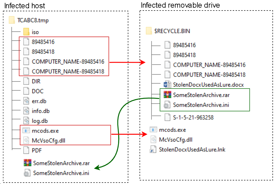 The implant also checks “%TEMP%\TCABC8.tmp” for the following files that are used to infect a removable drive whose serial number matches the name of the folder: