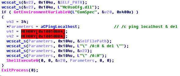 After the infection routine is completed, the second-step implant (“McVsoCfg.dll”) will try to remove itself from the drive by using a batch script executed via ShellExecuteW, which pings localhost (to give the implant’s host process time to terminate first) and then deletes the module.