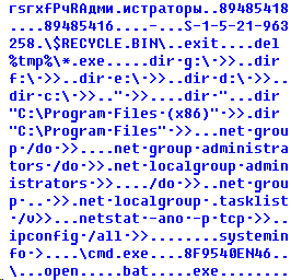 The third-step implant, “msgui.exe”, is quite small and simple – it is designed to execute a batch script with “cmd.exe” to collect data and save the output to the drive’s “$RECYCLE.BIN” folder so that it can be collected by the main module of the malware (when connected to the originally infected host). Then it looks for any fourth-step file to be executed and then deleted (if it exists).