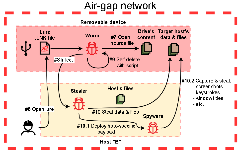 - implants of the second type were used to collect information about removable drives, shadow copy their contents and infect them with a worm, which was then used to exfiltrate data from air-gapped networks.