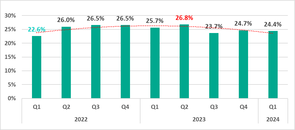 Compared to the first quarter of 2023, the percentage decreased by 1.3 pp.