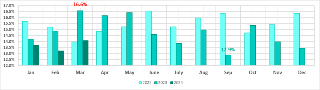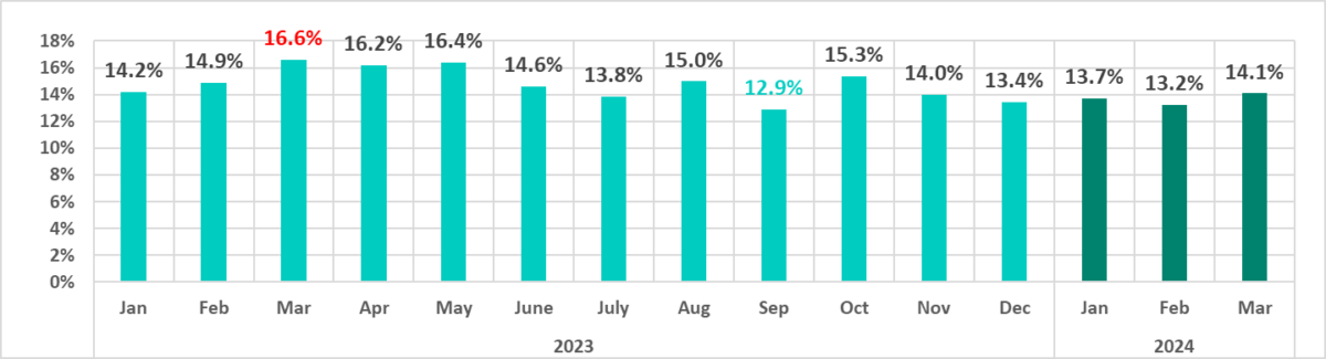 The percentages for the first three months of 2024 are significantly lower than those for the first three months of the previous year (2023).