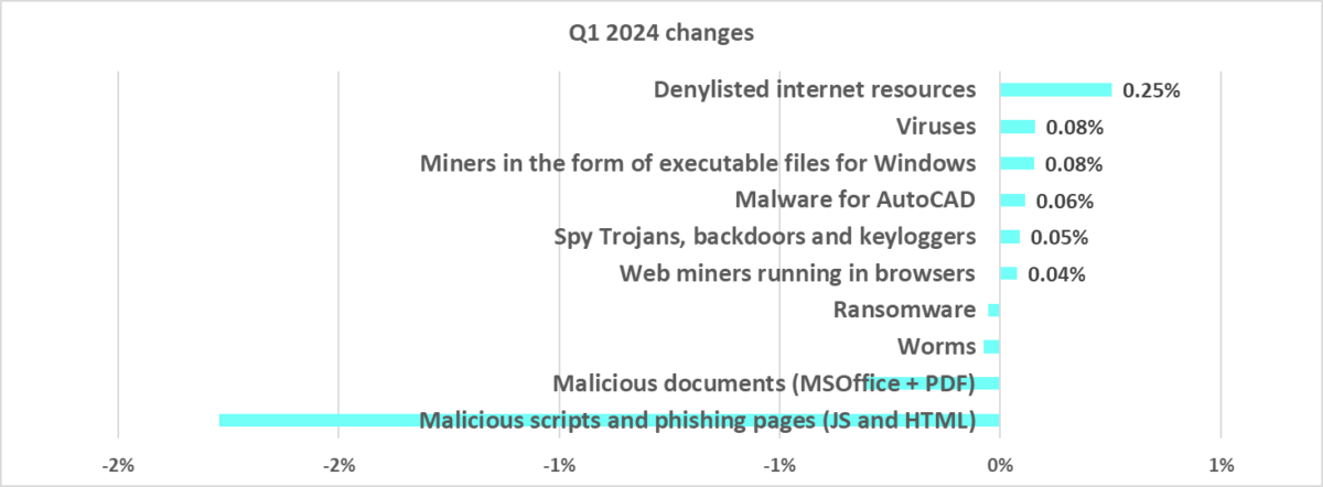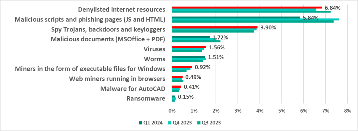 Compared to the previous quarter, in the first quarter of 2024, the most significant increase in the percentage of ICS computers on which malicious objects of various categories were blocked was as follows: