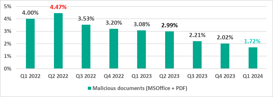 | Malicious documents (MSOffice + PDF) | 2.02% | 1.72% | -0.30 pp |