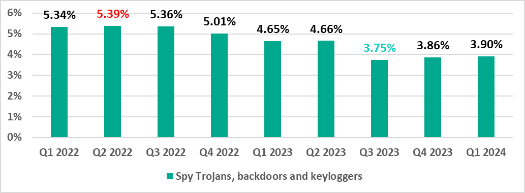 | Spy Trojans, backdoors and keyloggers | 3.86% | 3.90% | 0.04 pp |