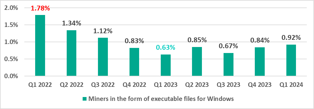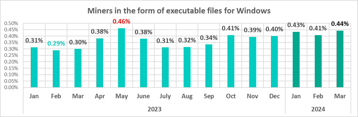 | Miners in the form of executable filesfor Windows | 0.84% | 0.92% | 0.08 pp |