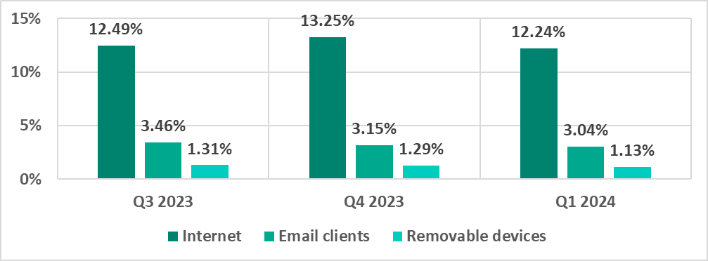 The first quarter of 2024 saw the lowest quarterly percentage since 2022 for threats from email and threats distributed on removable media. The last time the percentage was lower for the internet was two years ago, in the first quarter of 2022.