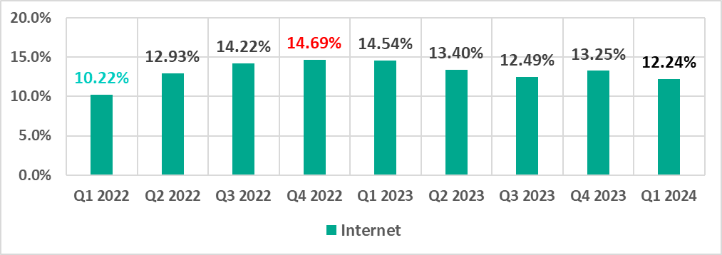 | Internet | 13.25% | 12.24% | -1.01pp |