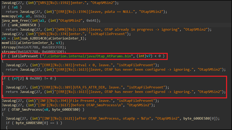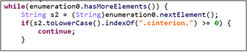 After reviewing the contents of the UFS, we found that it contained files and folders hidden from the user and inaccessible through the MES interface, namely .cinterion.internal and .cinterion.service. Access to them was restricted directly in the JRC MIDlet code, filtered by their name prefix. A code snippet from the JRC module that filters access to these folders is shown in Figure 13.