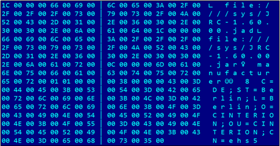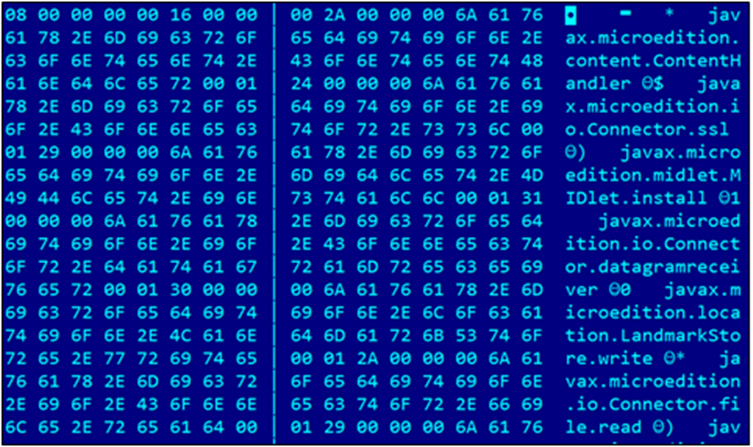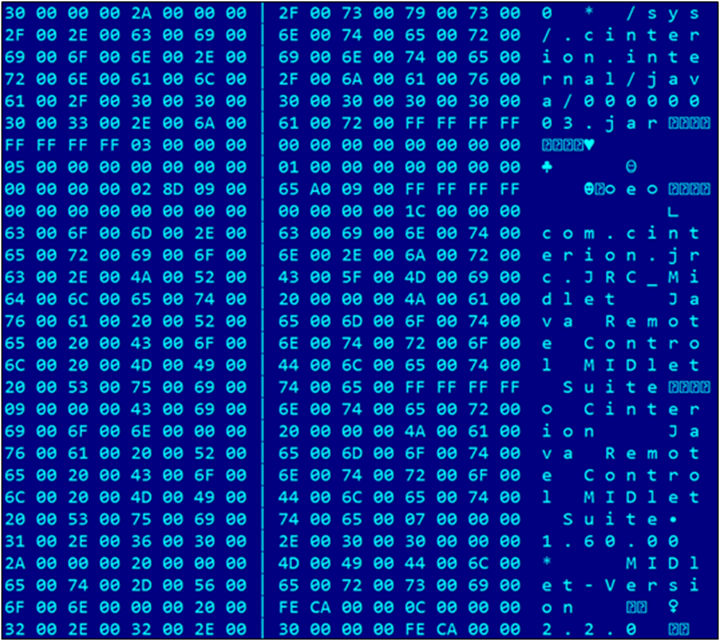 After analyzing the contents of the folder containing installed MIDlets, we determined that each MIDlet is renamed during the installation process. To allow the user to run MIDlets by their name, the system keeps the mapping between the original name of the MIDlet and its alias in a simple database stored in the _suites.dat file. For example, by analyzing the binary contents of this file, it is clear that the file named 00000003.jar is actually JRC.jar (Figure 14).