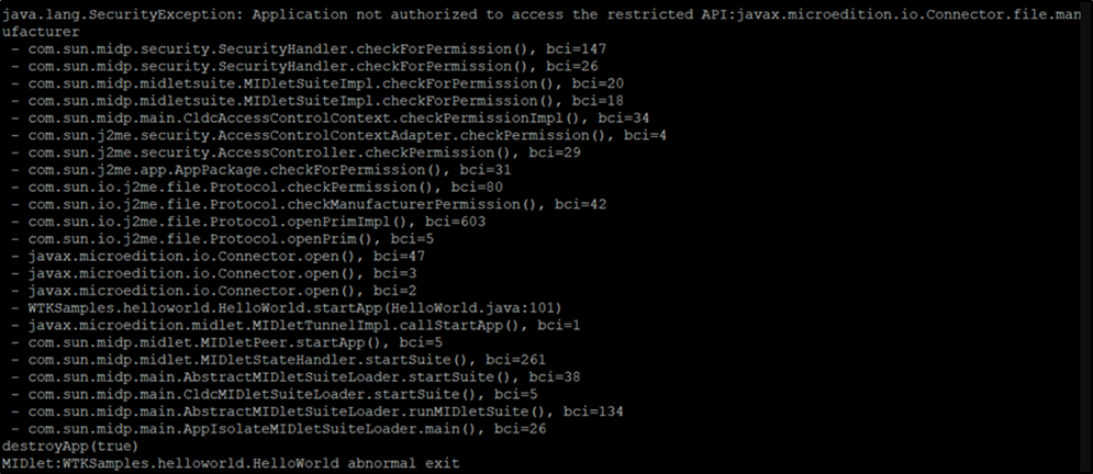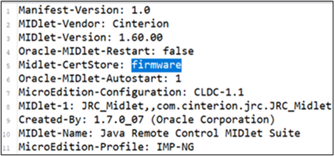 It is important to note that this permission set gives unrestricted access to the Java virtual machine’s system classes. The example shown corresponds to the manufacturer level of privileges. Only two MIDlets have such permissions: JRC and SLAE. Any user MIDlet must list in its manifest the classes and methods it needs to access to at runtime. Part of the manifest for our test MIDlet is shown in Figure 18.