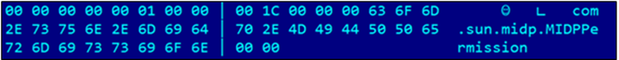 .ii extensionFinally, the .ss file contains a description of the Java-level permissions available to this MIDlet. An example of the JRC vendor MIDlet permissions description is shown in Figure 17.