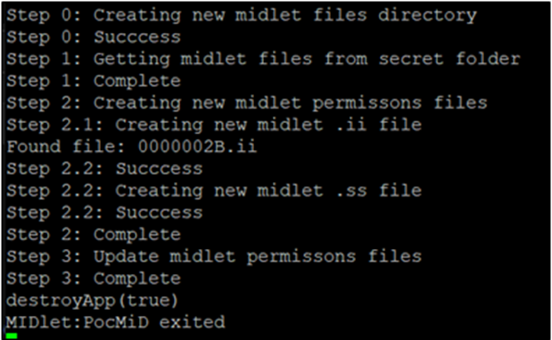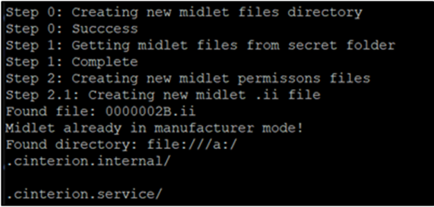 By further examining the contents of these hidden directories, we determined that all MIDlets (both of user and manufacturer categories) are stored at /sys/.cinterion.internal/java. Each MIDlet is stored as a set of four files with .ss, .ii, .ap and .jar extensions.