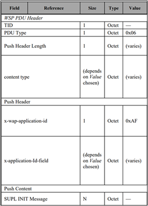 Messages are exchanged using the ULP (User-plane Location Protocol) binary protocol. In this protocol, data is transmitted in the GSM network via PUSH messages using the WAP protocol stack. A typical ULP message is illustrated by the SUPL INIT message (see Figure 22).