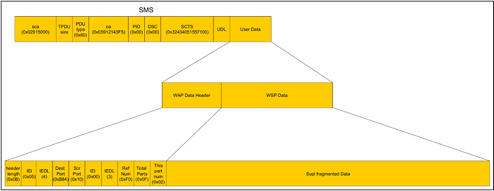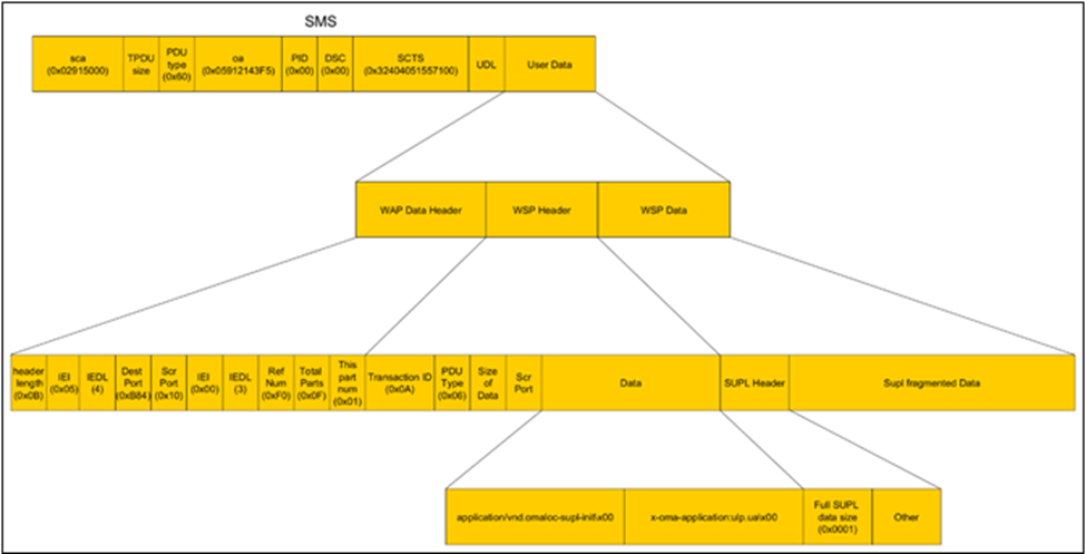 The ULP protocol supports the ability to fragment the transmitted message allowing transmission of large binary messages via SMS at the PUSH layer of WSP messages. On the SET side, the WSP protocol provides indexing for the fragmented SMS message transmission. The first SUPL message contains the total size of the message to be received, whereas subsequent messages contain data fragments to be concatenated. An example of the structure of these SMS messages is shown in Figure 23 and Figure 24.
