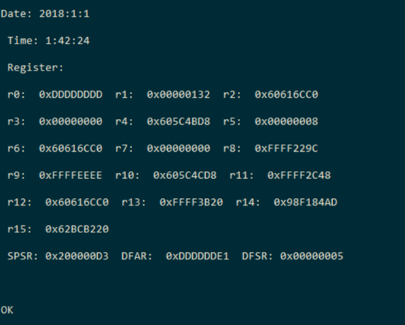 After crafting an appropriate SMS message, we managed to generate a heap overflow error, resulting in a hard fault and rebooting the modem. To learn the cause of the reboot, we used the previously mentioned AT+XLOG command (Figure 26).