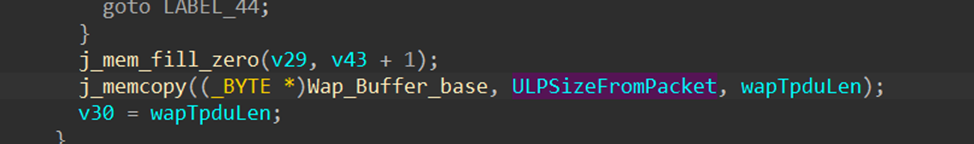 According to the transmission protocol, the ULPSizeFromPacket (size of the entire ULP packet) and wapTpduLen (size of the received WAP message) variables are calculated independently. That means a received WAP packet of size wapTpduLen will be unconditionally copied to a buffer whose size is ULPSizeFromPacket bytes (Figure 25). This is a classic example of a heap-based buffer overflow.