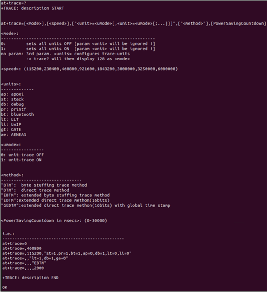AT+TRACE=,115200,"st=0,pr=1,bt=0,ap=1,db=1,lt=0,li=0"