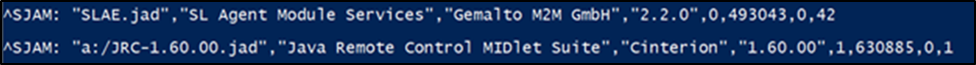 Local installation of MIDlets is performed in two steps. First, the MIDlet files (.jar and .jad) must be copied to the modem UFS. Next, the MIDlet is installed on the modem using the AT^SJAM=0 AT command. During the execution of this command, the MIDlet files are copied to a part of the modem FS that is inaccessible to the user and are then removed from the UFS. The path to which MIDlets are copied during installation is unknown. This helps ensure the confidentiality of both user and manufacturer MIDlets. An installed MIDlet is launched from its new location in the modem FS. A list of all installed MIDlets can also be extracted using the AT^SJAM command. Figure 1 shows an example of the output of this command.