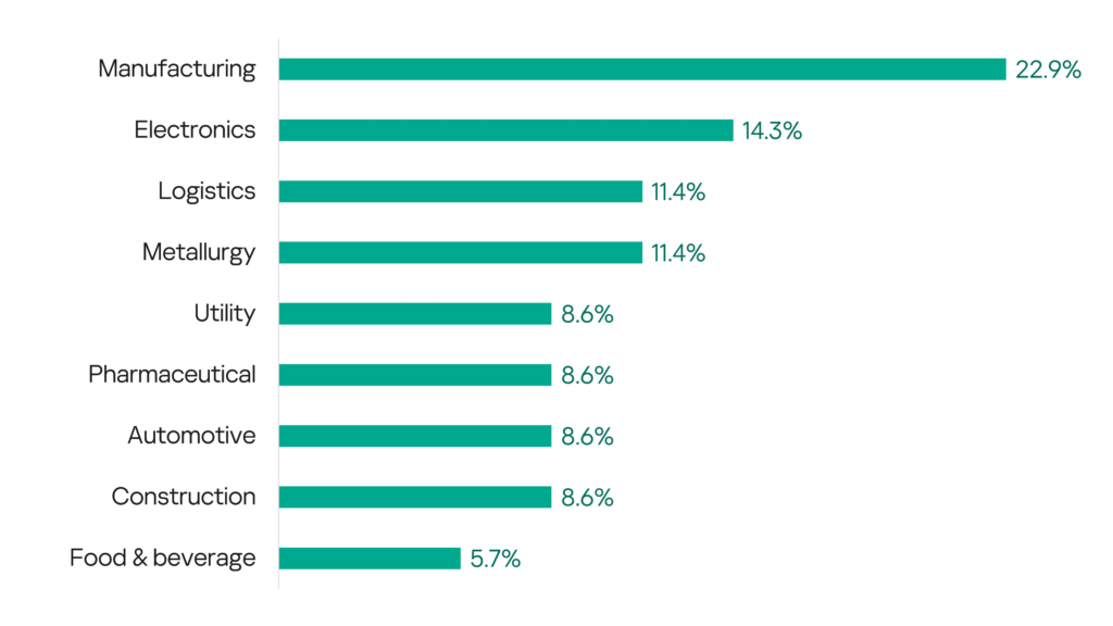 In the second quarter of 2024, 35 incidents were publicly confirmed by victims. Half of the attacks reportedly resulted in the denial of operations or product shipments. The majority of victims are various types of manufacturing enterprises that produce goods for sectors such as electronics, automotive, agriculture, medical and construction. In addition to manufacturing, other types of industrial companies also fell victim, including utilities, transportation and logistics, pharmaceuticals, and food and beverage.