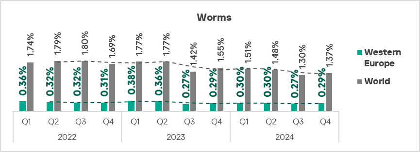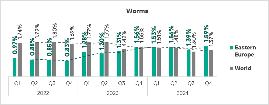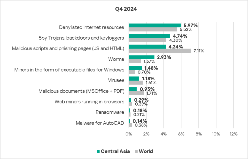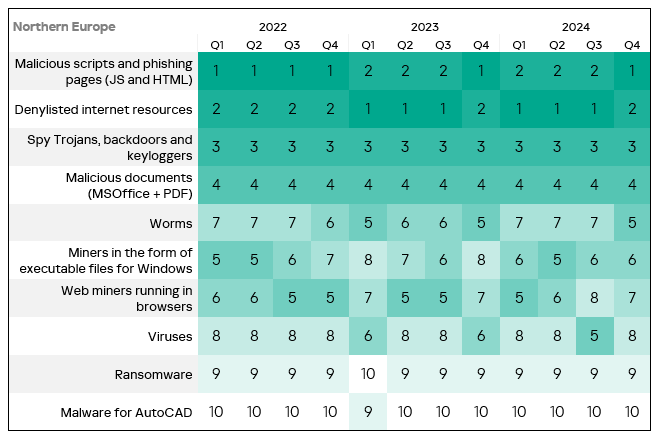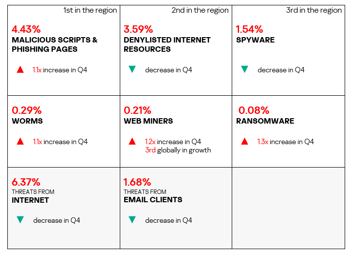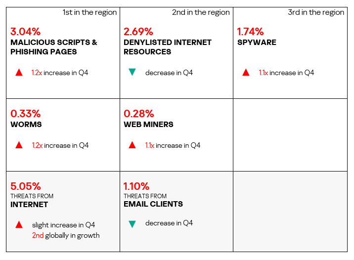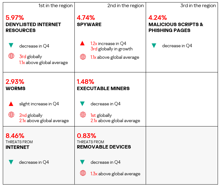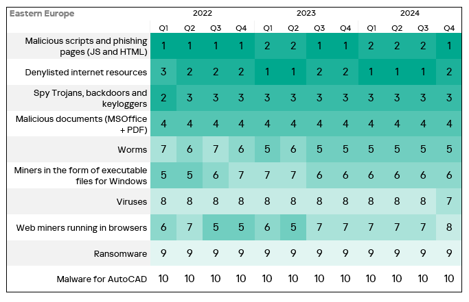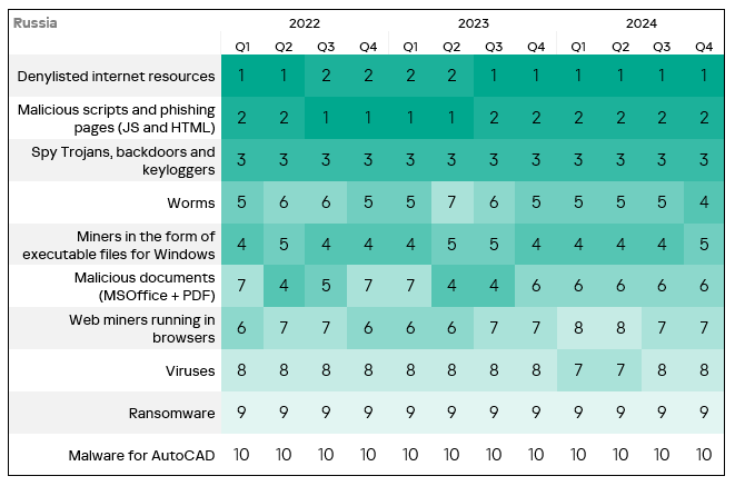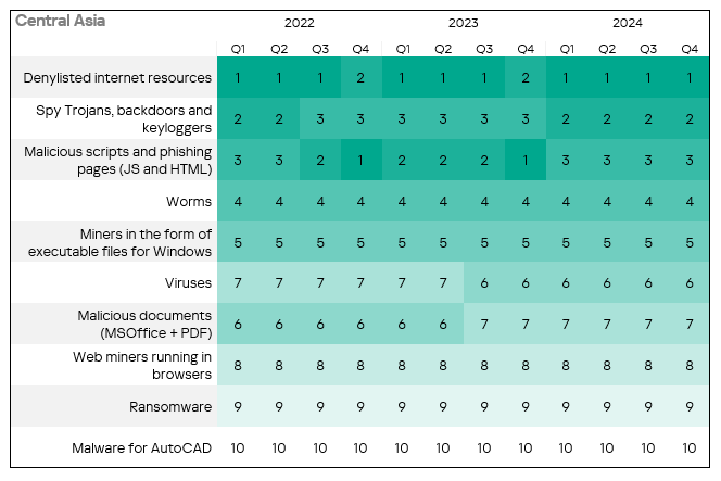- The heatmap below illustrates changes in the rankings of threat categories in the region since the beginning of 2022. Denylisted internet resources have been the leading threat category in the region since Q3 2023. Worms moved up one position in Q4 2024 – from fifth to fourth.