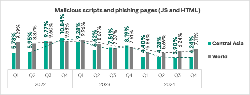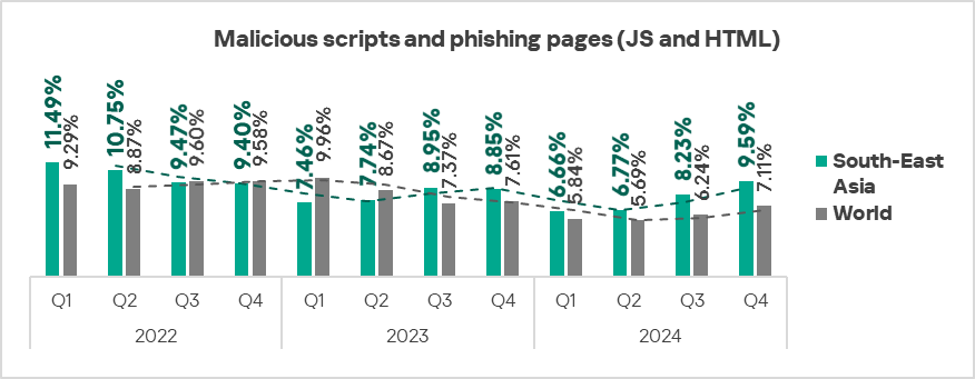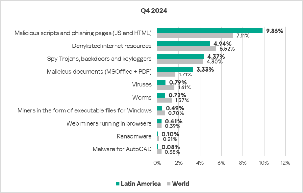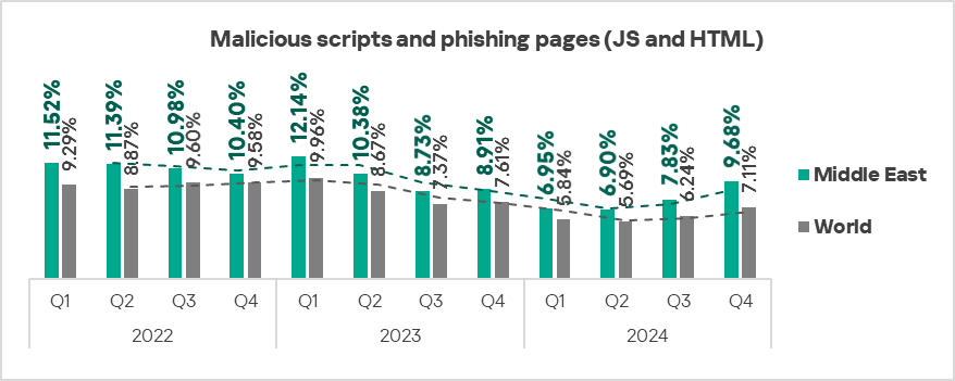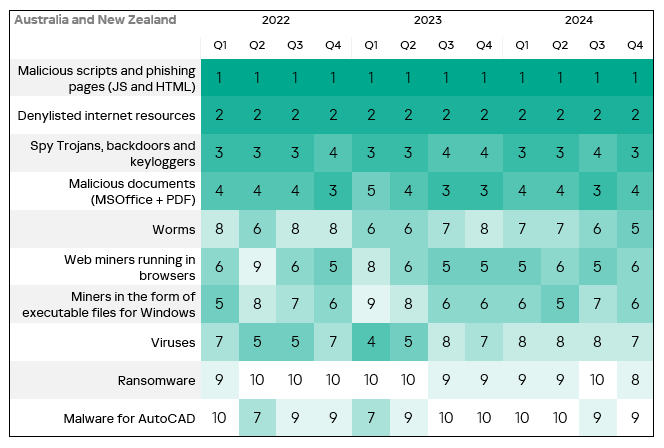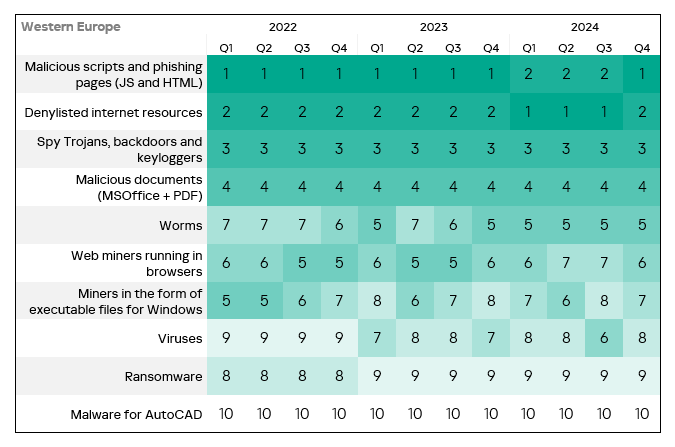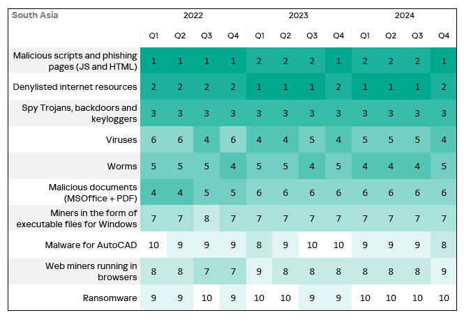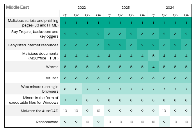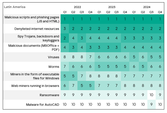 - The heatmap below illustrates changes in the rankings of threat categories in the region since the beginning of 2022. Malicious scripts and phishing pages moved to the top of the ranking in Q4 2024.
