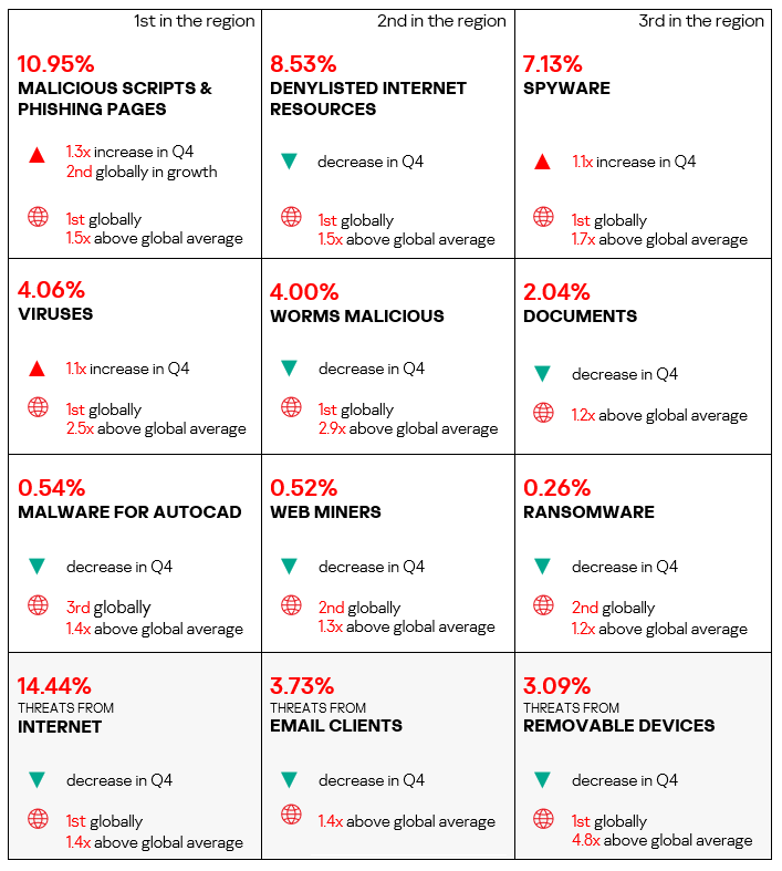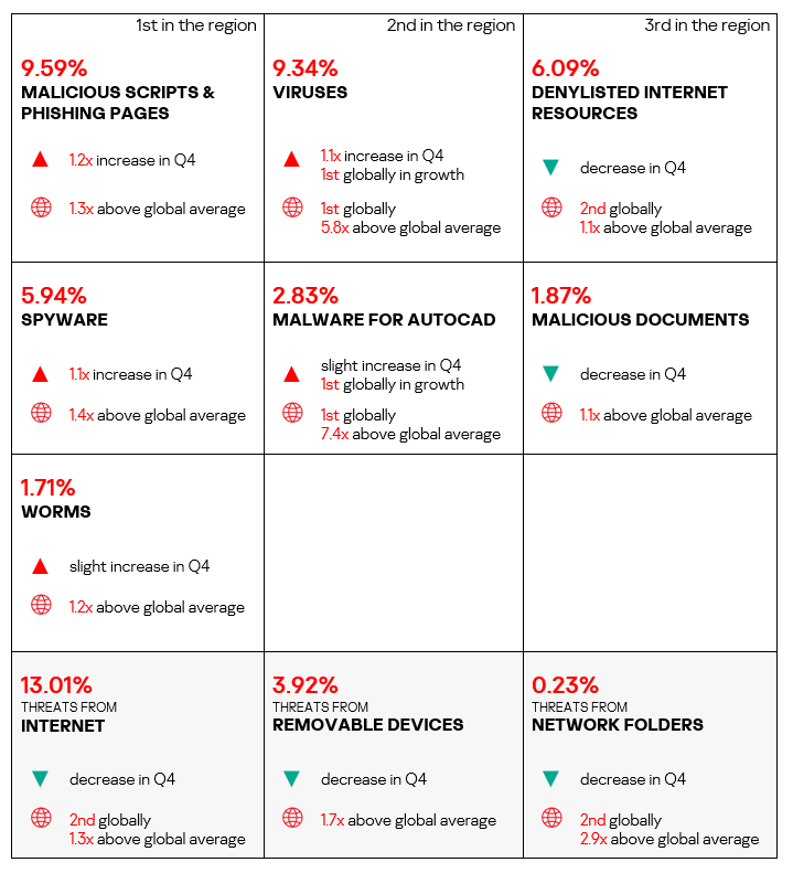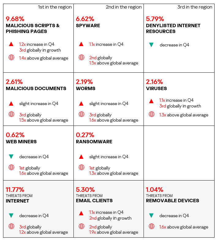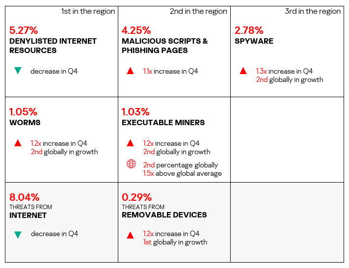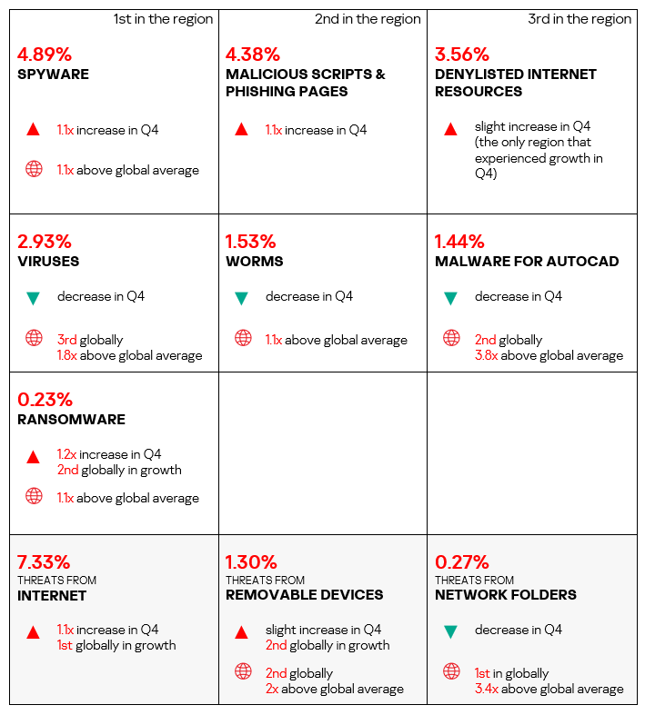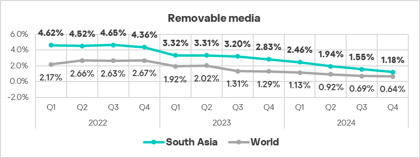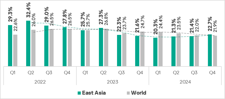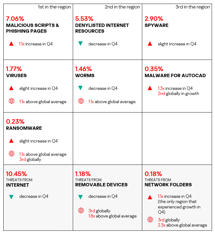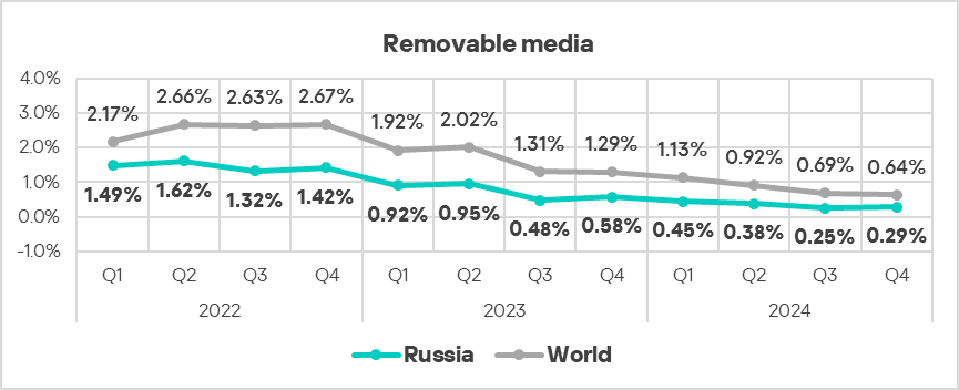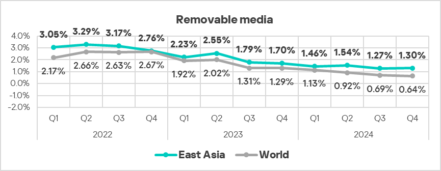 - Threats from removable devices saw an increase of 1.2 times in Q4 2024. This indicator was first in terms of growth in the ranking of all global regions.