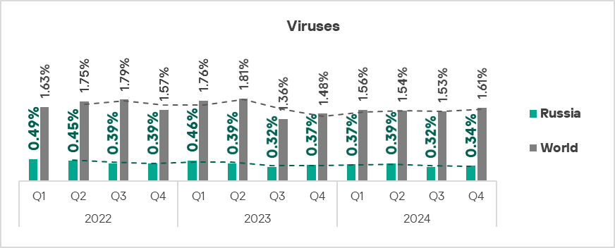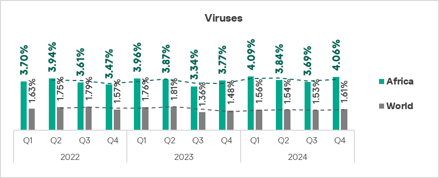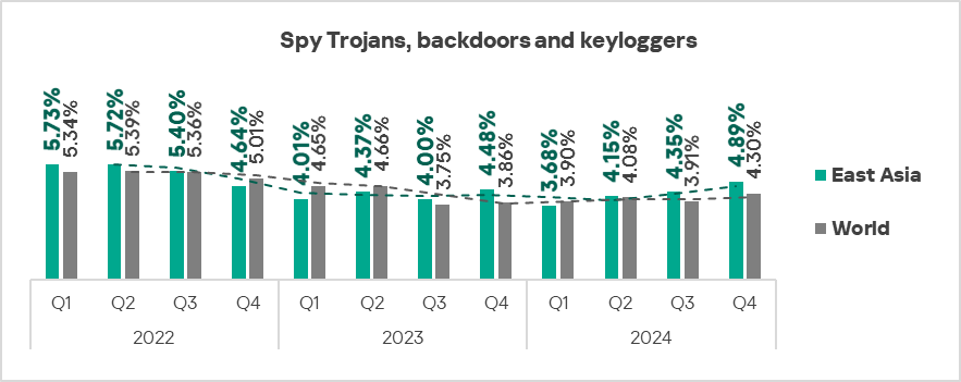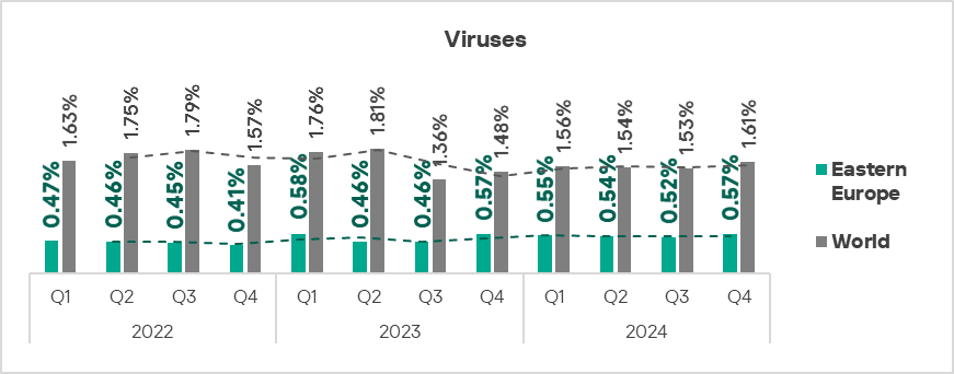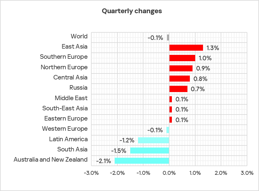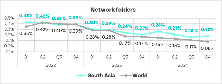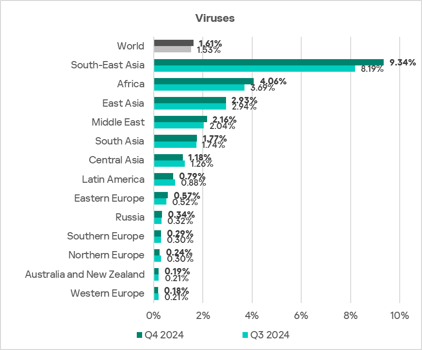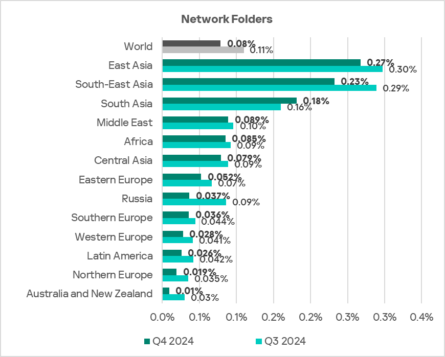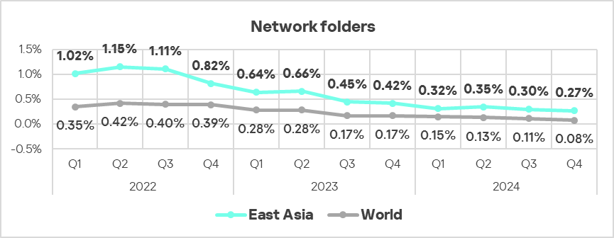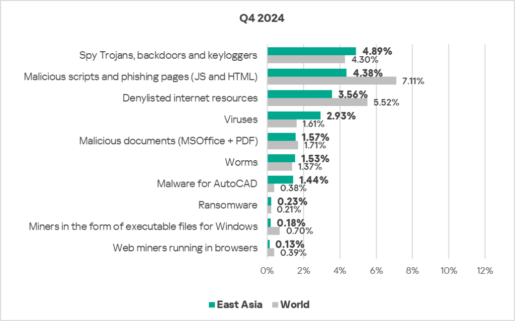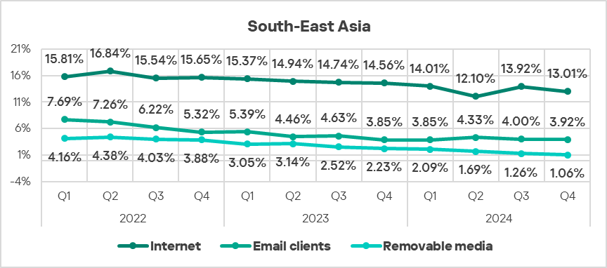 - Threats from removable devices saw an increase of 1.2 times in Q4 2024. This indicator was first in terms of growth in the ranking of all global regions.