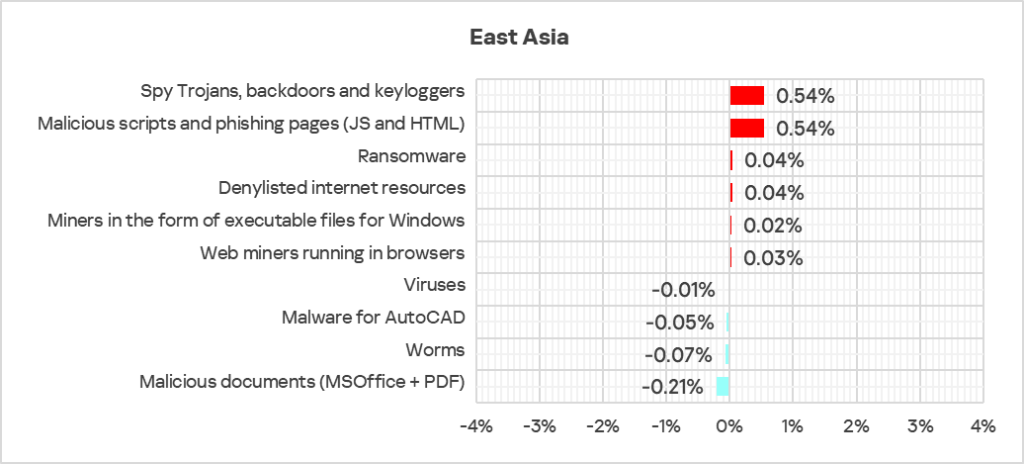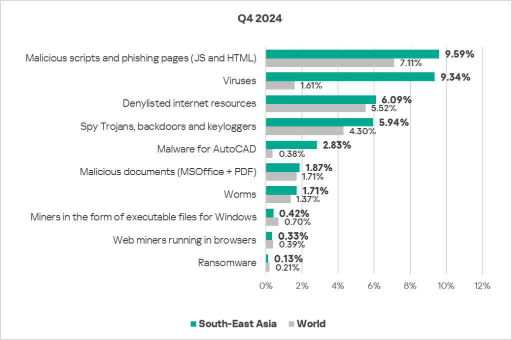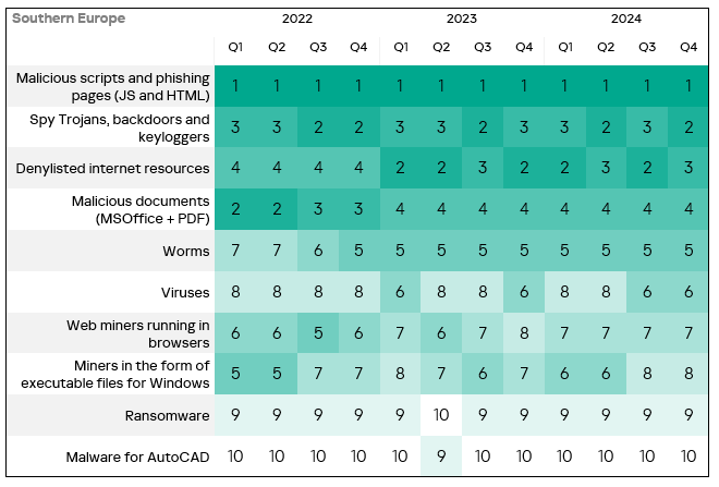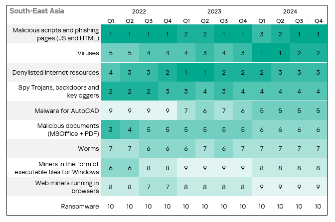- The heatmap below illustrates changes in the rankings of threat categories in the region since the beginning of 2022. Malicious scripts moved back to first place in Q4 2024. Viruses dropped back to eighth place in the regional threat category ranking.