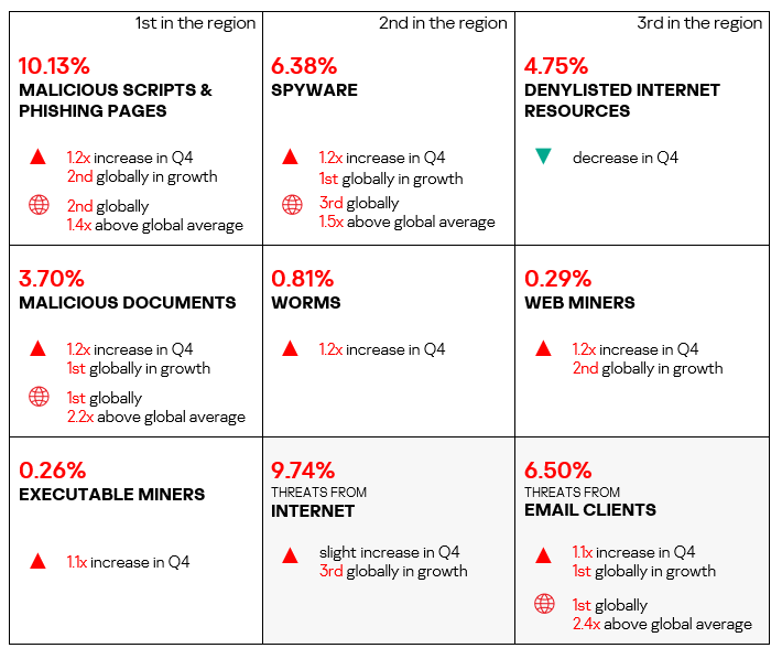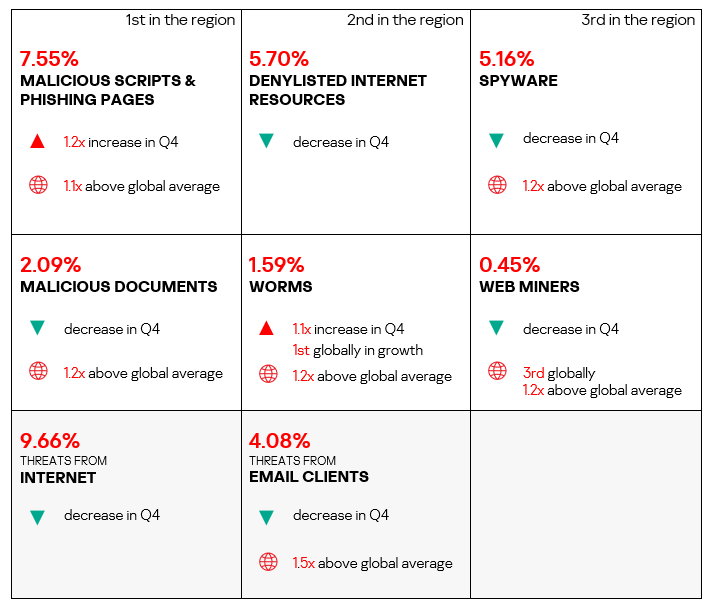 - The heatmap below illustrates changes in the rankings of threat categories in the region since the beginning of 2022. Malicious scripts and phishing pages have been the leading threat category in the region throughout the observed period, while denylisted internet resources have consistently ranked second. In Q4 2024, spyware moved to third place, surpassing malicious documents. Worms moved from sixth to fifth place in the regional rating.
