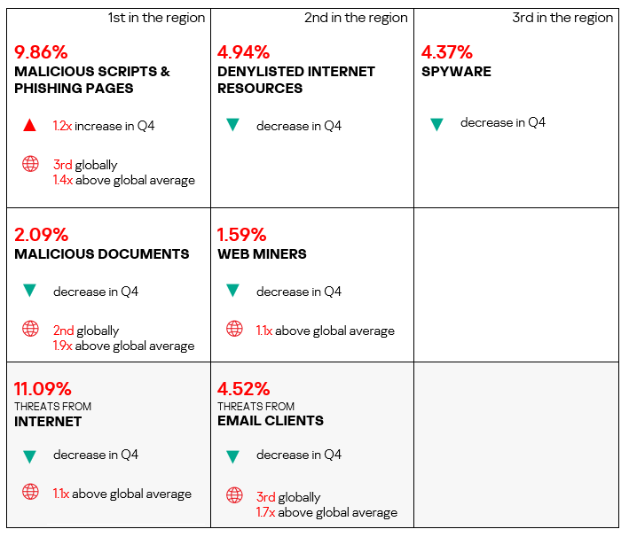 - The heatmap below illustrates changes in the rankings of threat categories in the region since the beginning of 2022. Malicious scripts and phishing pages have been the leading threat category in the region throughout the observed period. Spyware moved back to second from third place in Q4 2024.