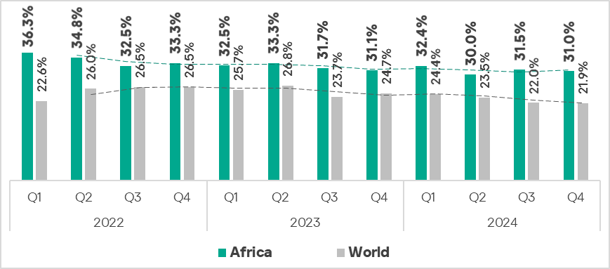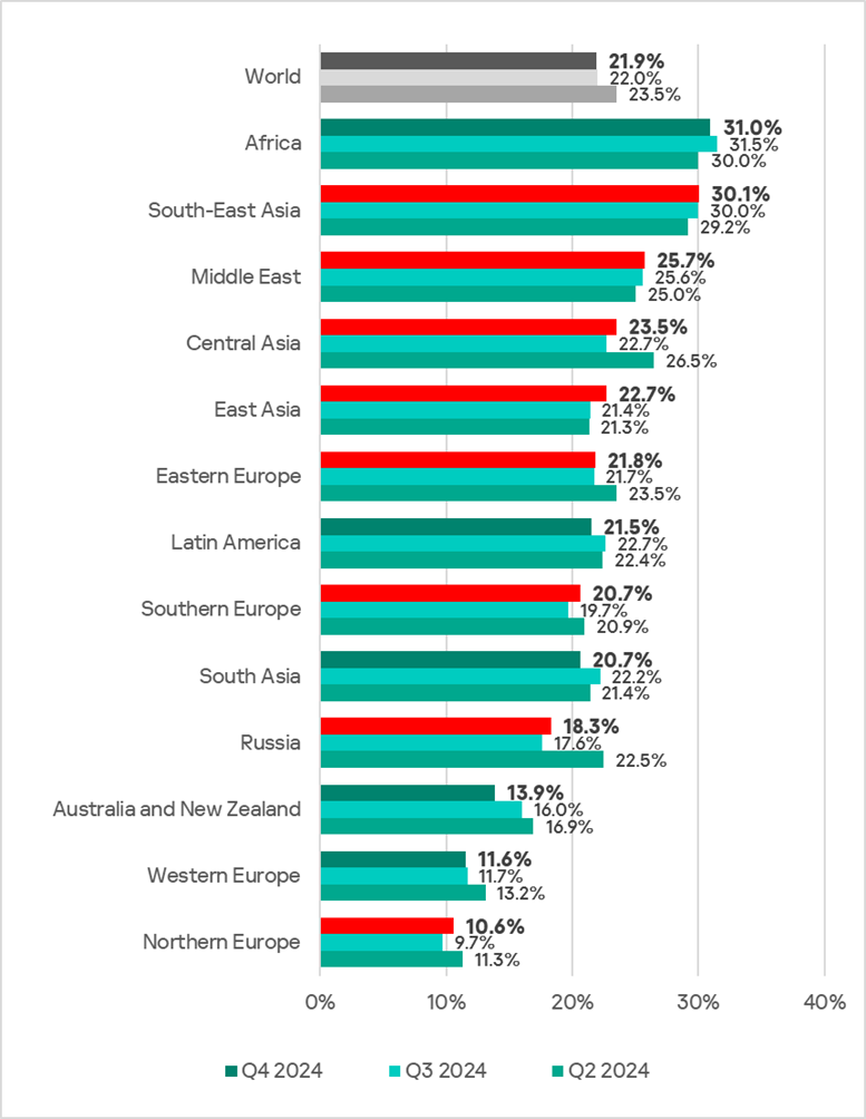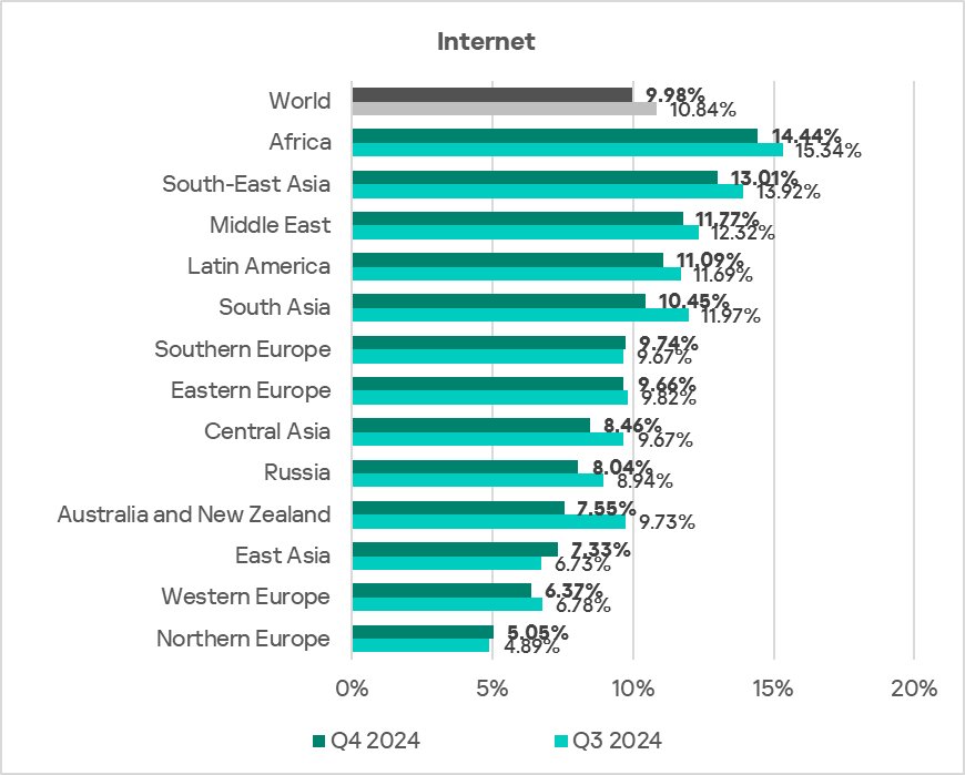 In Q4 2024, Africa, South-East Asia, and the Middle East ranked as the top three regions by the percentage of ICS computers on which threats from the internet were blocked.