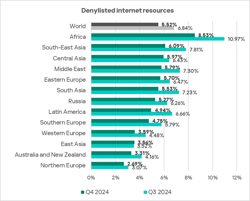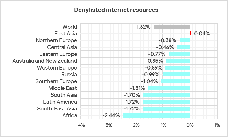 Africa, South-East Asia, and Central Asia ranked as the top three regions by the percentage of ICS computers on which denylisted internet resources were blocked.