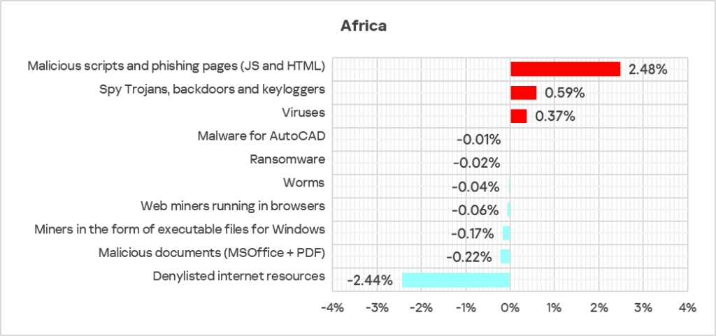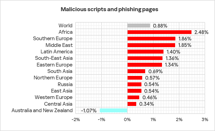The top three regions in terms of growth in the percentage of ICS computers on which malicious scripts and phishing pages were blocked were Africa, Southern Europe, and the Middle East.