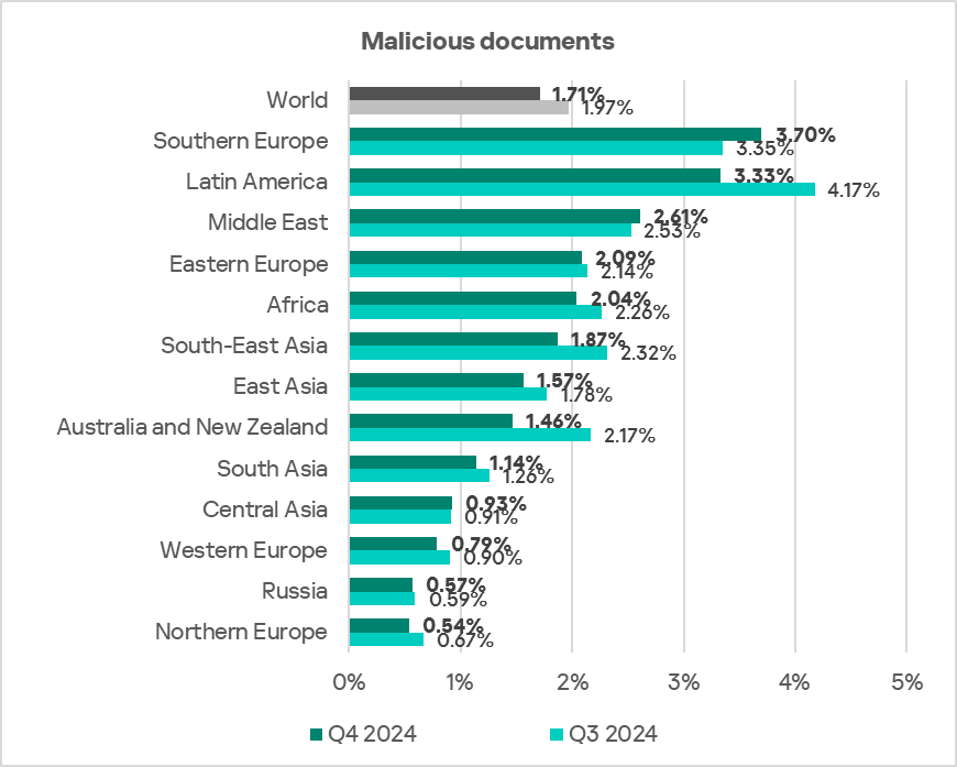 - Malicious documents: 2.2 times higher (surpassing Q3 2024 levels), ranked first by value among the regions.