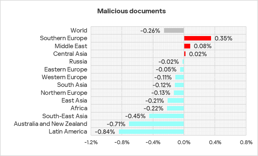 The only three regions in terms of growth in the percentage of ICS computers on which malicious documents were blocked were Southern Europe, the Middle East, and Central Asia.
