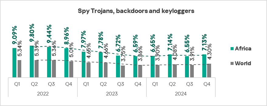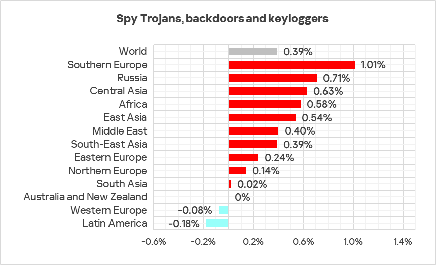 - The Middle East, Southern Europe, and Central Asia: spyware is the second most prevalent threat in these regions.