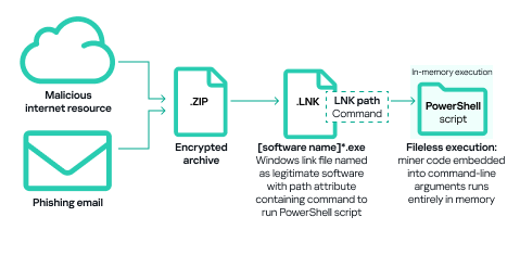 In the fourth quarter of 2024, similar to the previous quarter, a significant portion of Windows miners found on ICS computers consisted of archives with names mimicking legitimate software. These archives did not contain actual software but included a Windows LNK file, commonly known as a shortcut. However, the target (or path) that the LNK file points to is not a regular application, but rather a command capable of executing malicious code, such as a PowerShell script. Nowadays, threat actors are increasingly using PowerShell to execute malware, including cryptominers, by embedding malicious code directly into command-line arguments. This code runs entirely in memory, enabling fileless execution and minimizing detection.