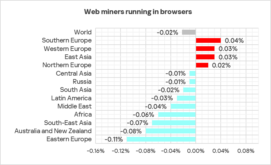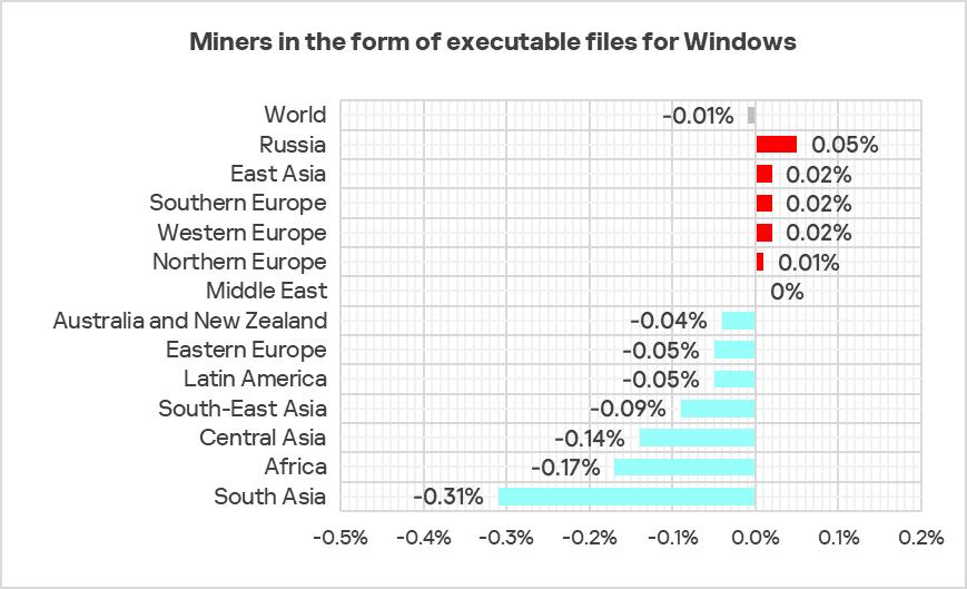 The top regions in terms of growth in the percentage of ICS computers on which miners in the form of Windows executable files were blocked were Russia, East Asia, Southern Europe, and Western Europe.