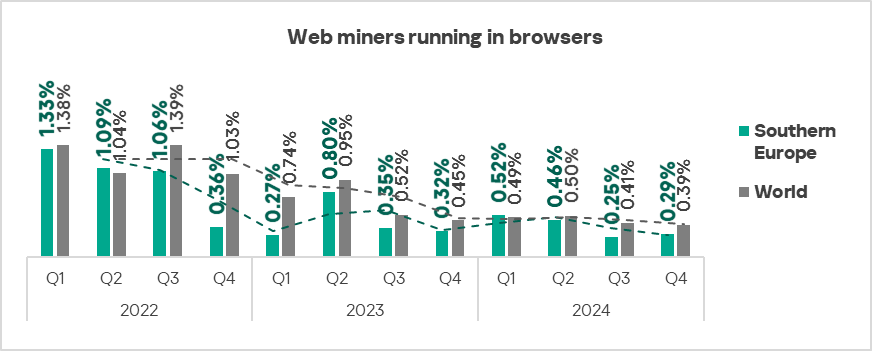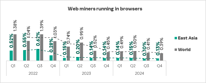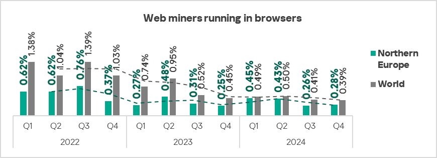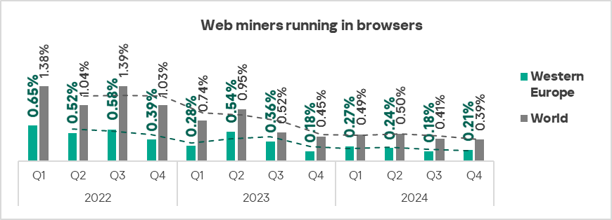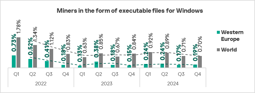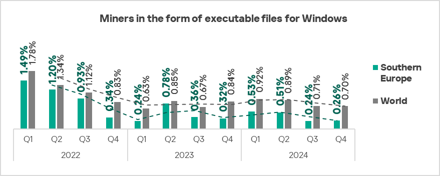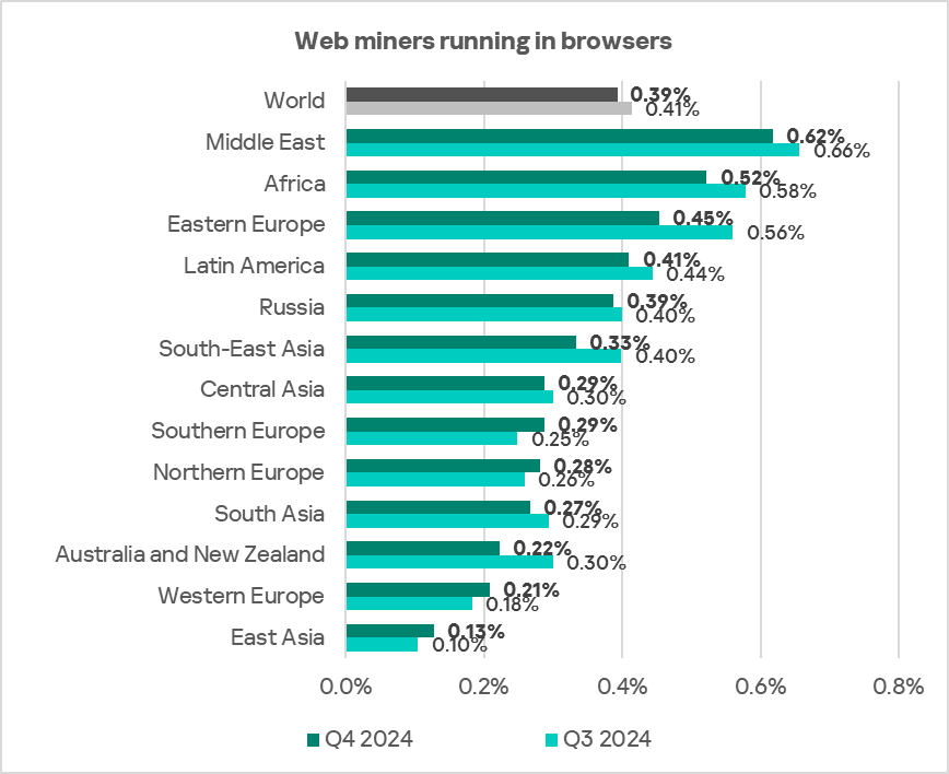 - Compared to the global figures, the region has a higher percentage of ICS computers on which miners in the form of executable files for Windows were blocked: 1.5 times higher (surpassing Q3 2024 levels), ranked second by value globally.