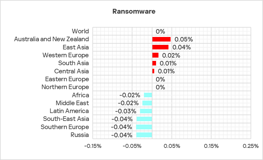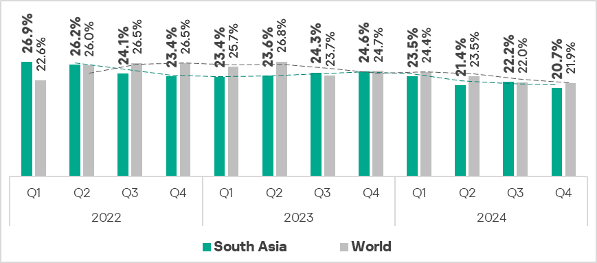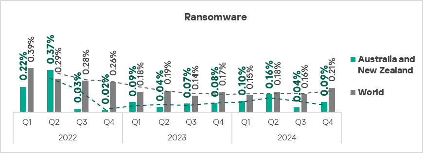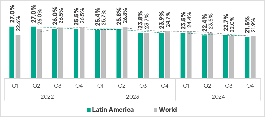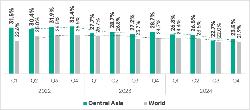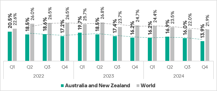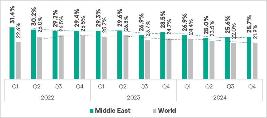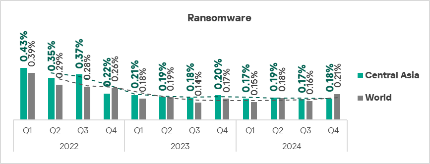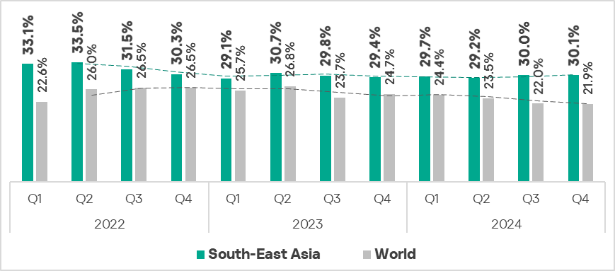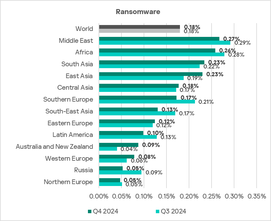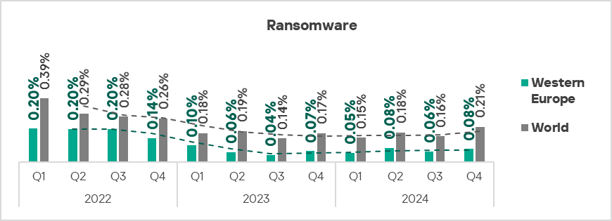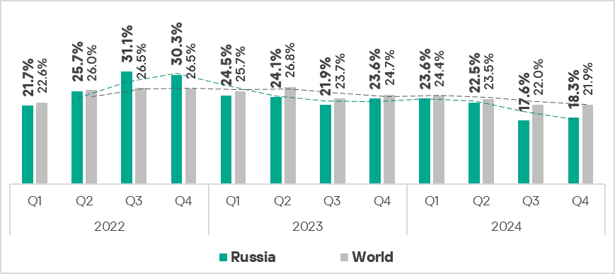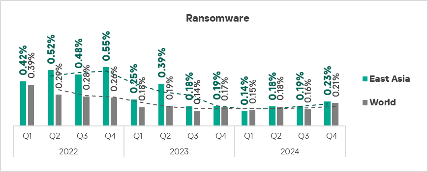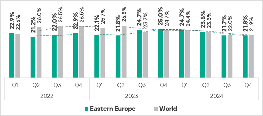 - Compared to the previous quarter, the largest proportional increase was in the percentage of ICS computers on which ransomware was blocked – by 2.3 times. The region ranked first globally in terms of growth of ransomware in Q4 2024.