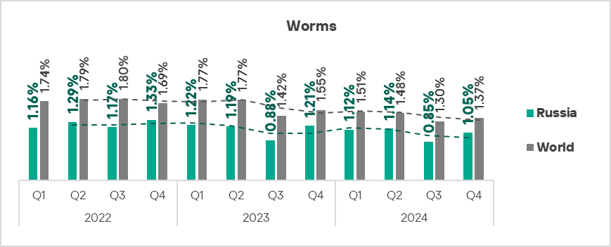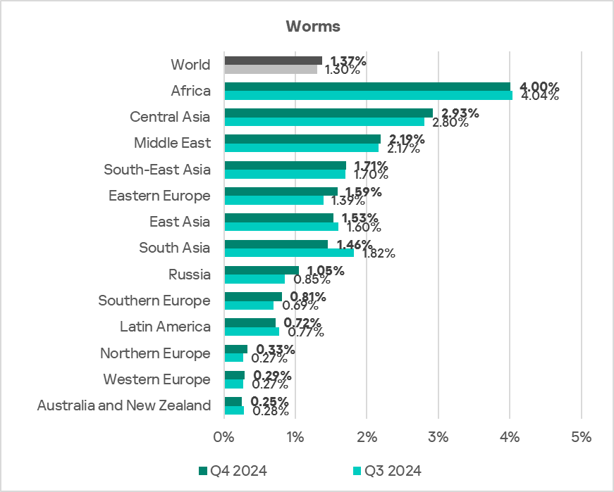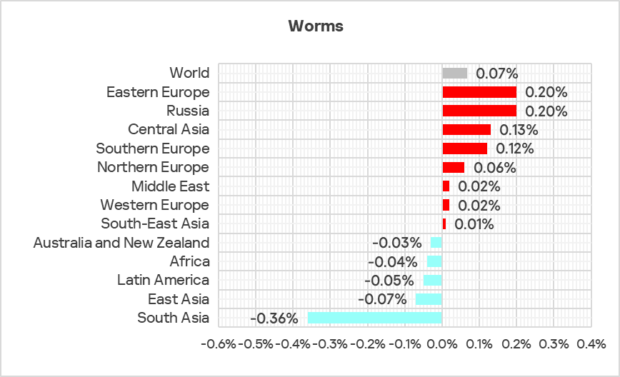 Globally, worms are in sixth place in the threat category ranking by percentage of ICS computers on which they were blocked. In similar regional rankings, worms rank much higher in the following regions: Russia, Central Asia – fourth place in the respective regional ranking.