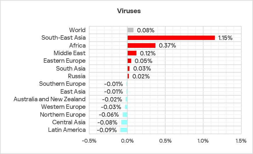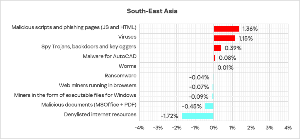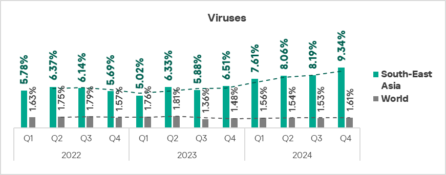 In South-East Asia, viruses are in second place in the regional threat category ranking by percentage of ICS computers on which they were blocked.