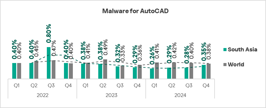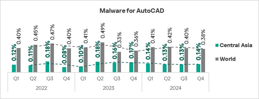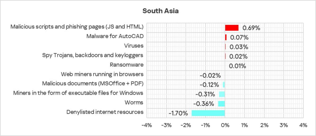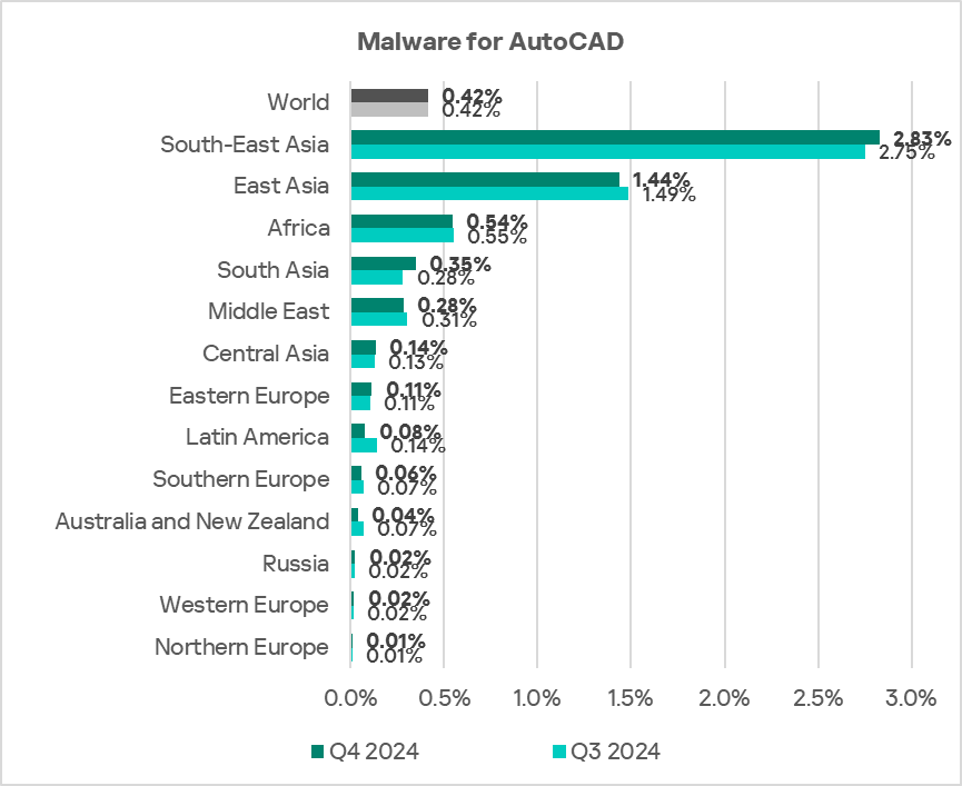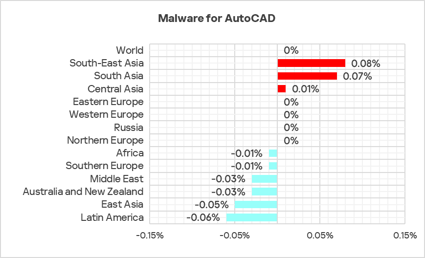 The only three regions with growth in the percentage of ICS computers on which malware for AutoCAD was blocked were South-East Asia, South Asia, and Central Asia.